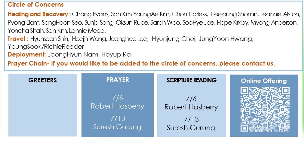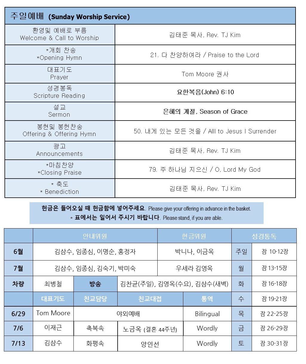 * Our 43rd Anniversary Thanksgiving Service will take place on Sunday, July 6. During both the first and second services, we will take time to give thanks for God’s grace and faithfulness over the past 43 years.