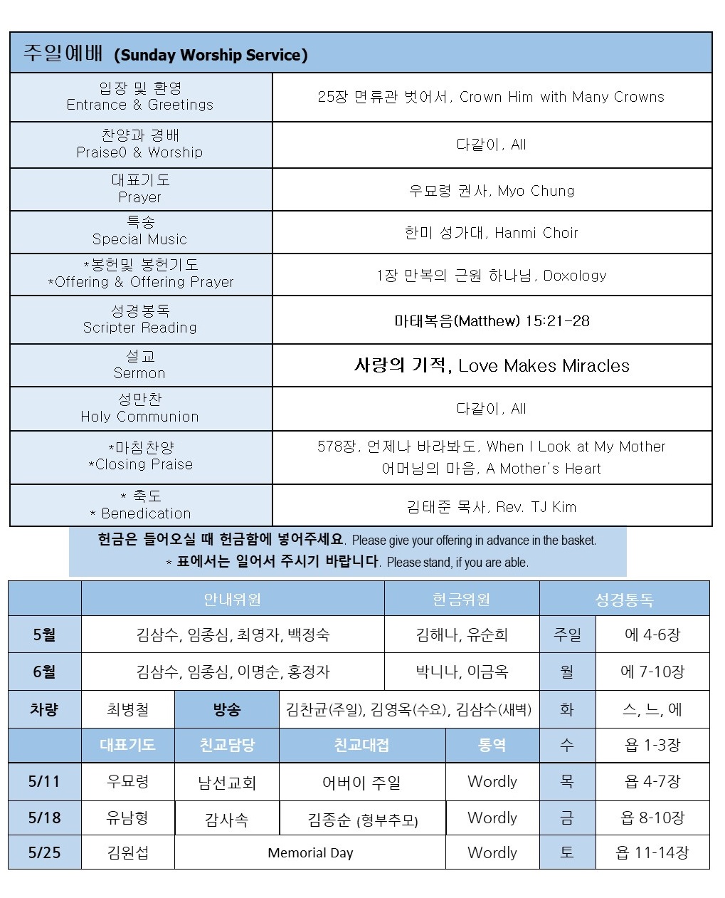 * 봄 대심방이 진행중입니다. 오는 주간(5/13~18)에는 자비속 심방이 있겠으며, 다음 주간(5/20~25)은 찬미속과 축복속 심방이 이어집니다.