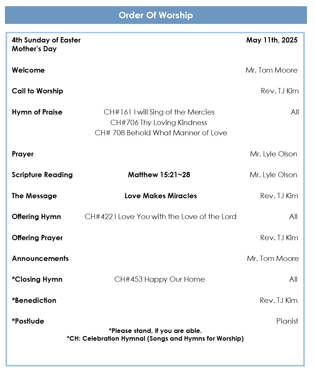 * Welcome! We are so glad that you are here to worship with us today! Today is a Mother’s Day. May this day be one of heartfelt gratitude as you reflect upon and honor the love of a mother.