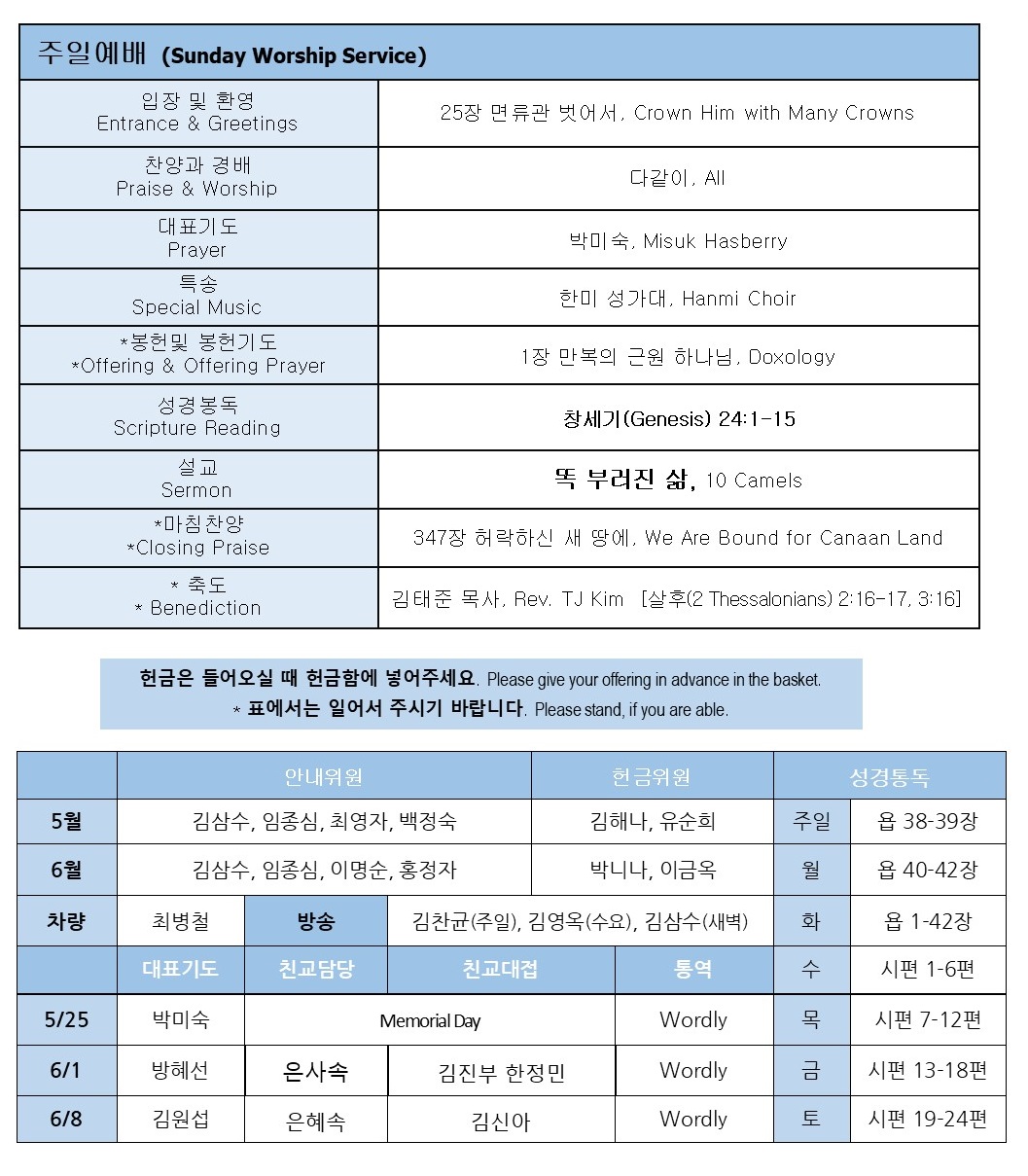 * 오늘은은 메모리얼데이 연휴을 맞아 예배 후 점심 친교가 없습니다.