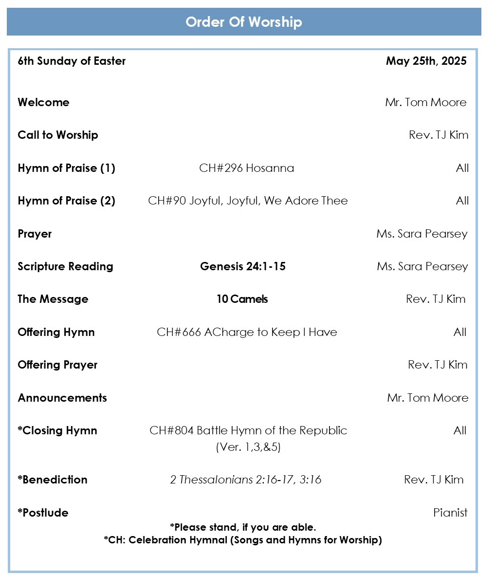 * The 1st Korean-American Annual Conference will be held from June 2 to 5 at the Korean Methodist Church of Detroit. A total of seven members from our church, including Senior Pastor, will be attending. We ask for your prayers for the conference.