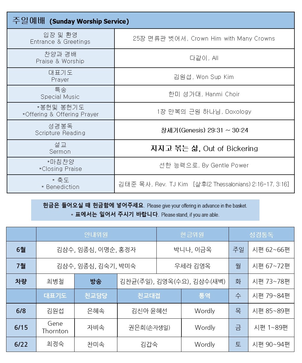 * 오는 6월 23일(월)부터 26일(목)까지, 콜로라도 스프링스에서 열리는 한미연회 중부지방회 목회자 가족 수양회가 우리 교회에서 있습니다. 도우실 수 있는 분들은 준비팀장이신 김영옥 권사님이나 여선교회 총회장이신 남정희 권사님께 말씀해 주시기 바랍니다. 교우 여러분의 많은 도움을 부탁드립니다.