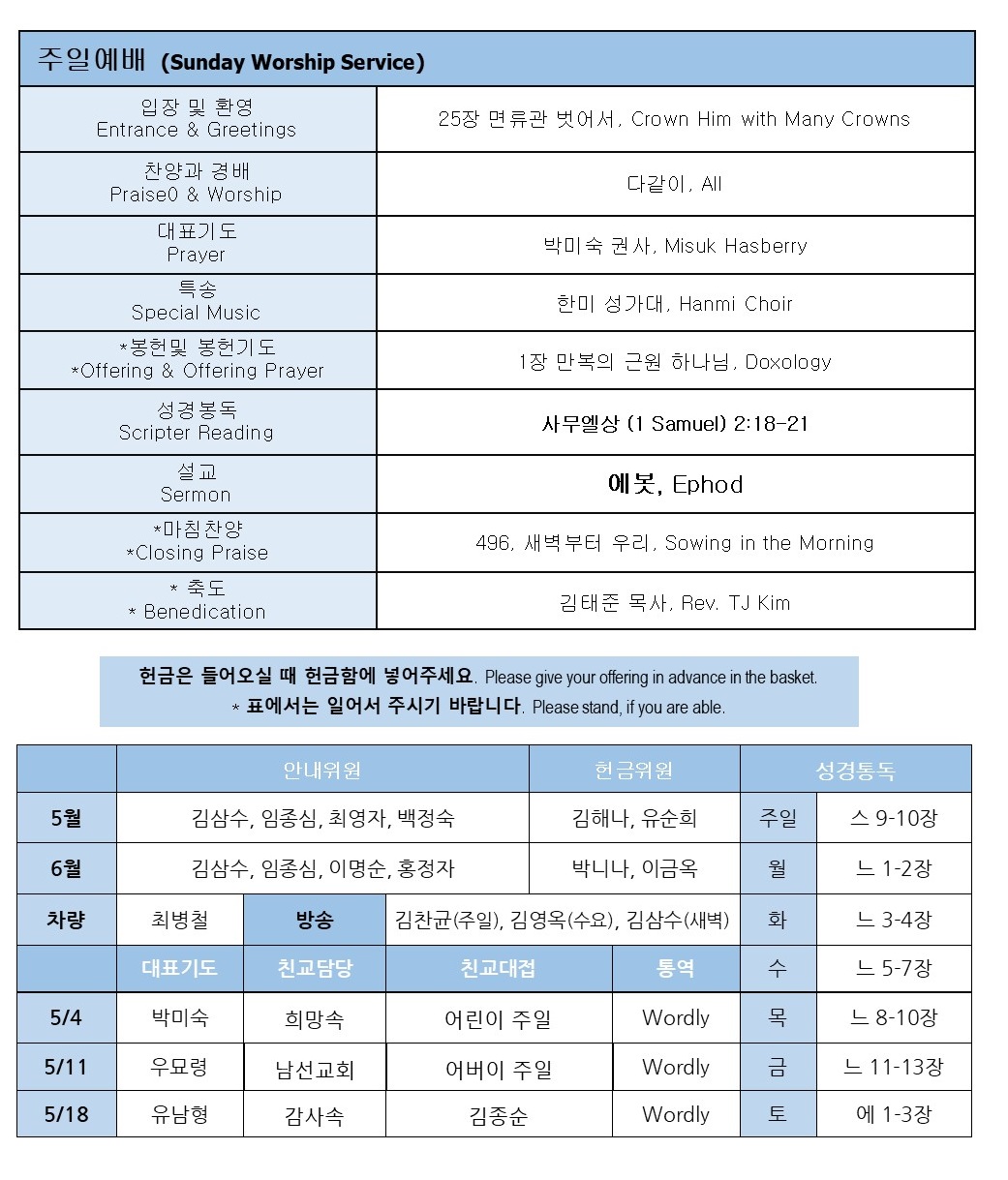 * 봄 대심방이 진행중입니다. 오는 주간에는 (5/6~11) 은혜속과 화평속의 심방이 있겠으며, 다음주간에는 (5/13~18) 자비속 심방이 있겠습니다. 심방을 원하시는 가정은 심방 신청서를 속장님을 통해서 제출해 주시기 바랍니다.
