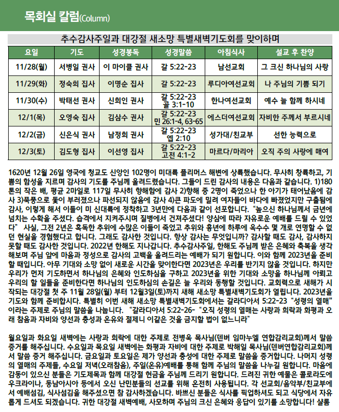 추수감사주일과 대강절 새소망 특별새벽기도회를 맞이하며
