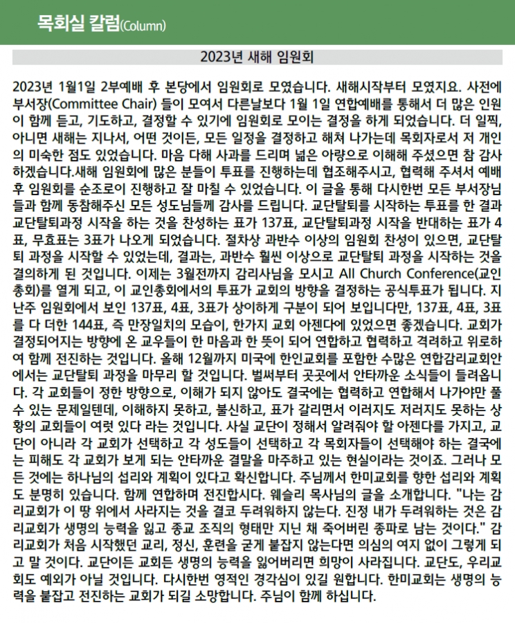 - 다음글함께 웃고, 함께 울며, 함께 전진하는 교회 23.01.04
