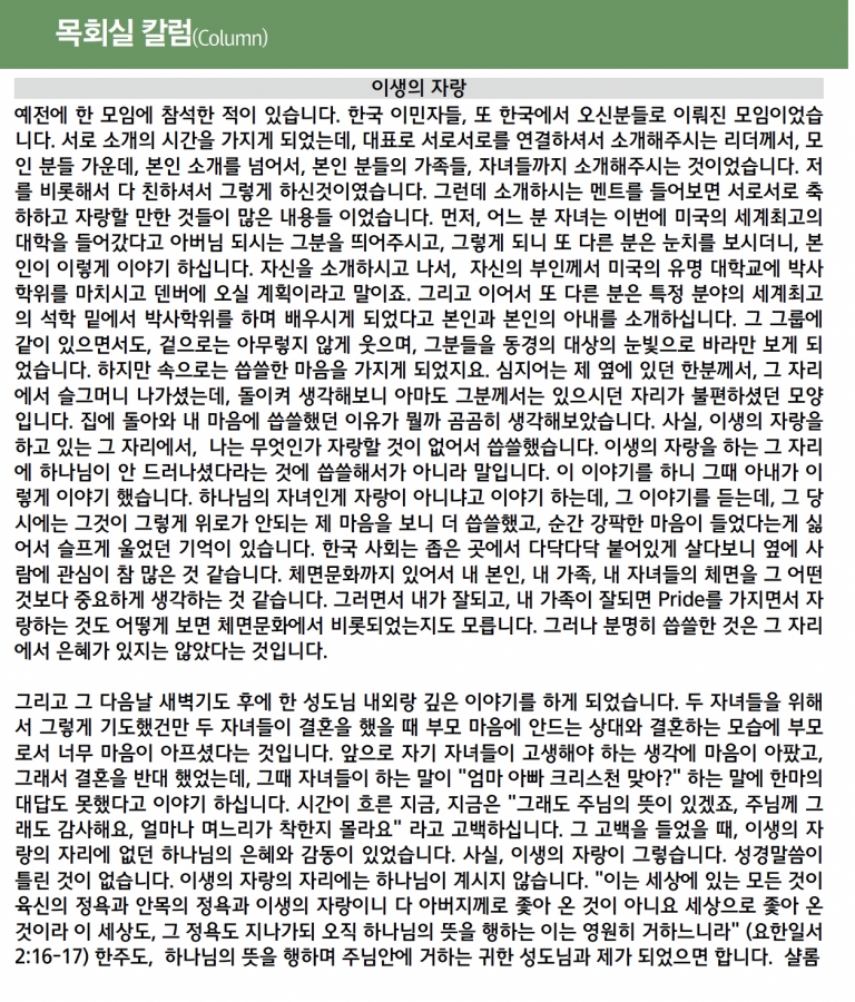 이생의 자랑 페이지 정보 작성자 한미연합감리교회 조회 1,068회 작성일 22-10-10 01:26 목록 본문 이생의 자랑 이전글이땅에 묻고 가슴에 묻은 사람이 있다면 22.10.17 다음글교회와 벽이 느껴질 때 22.10.01 댓글 0 댓글목록 등록된 댓글이 없습니다. 목록