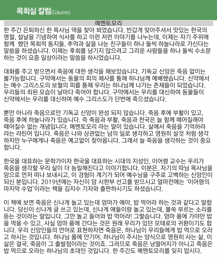 메멘토모리 페이지 정보 작성자 한미연합감리교회 조회 1,127회 작성일 22-02-05 04:47 목록 본문 메멘토모리 이전글Brokenness Before God 22.02.13 다음글Thankfulness Bring Blessings of Joy and Gratitude 22.02.05 댓글 0 댓글목록 등록된 댓글이 없습니다. 목록