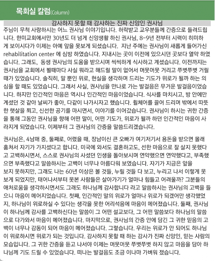 감사하지 못할 때 감사하는 진짜 신앙인 권사님 페이지 정보 작성자 한미연합감리교회 조회 1,132회 작성일 22-02-13 13:15 목록 본문 감사하지 못할 때 감사하는 진짜 신앙인 권사님 이전글Wasting Time 22.02.22 다음글Brokenness Before God 22.02.13 댓글 0 댓글목록 등록된 댓글이 없습니다. 목록