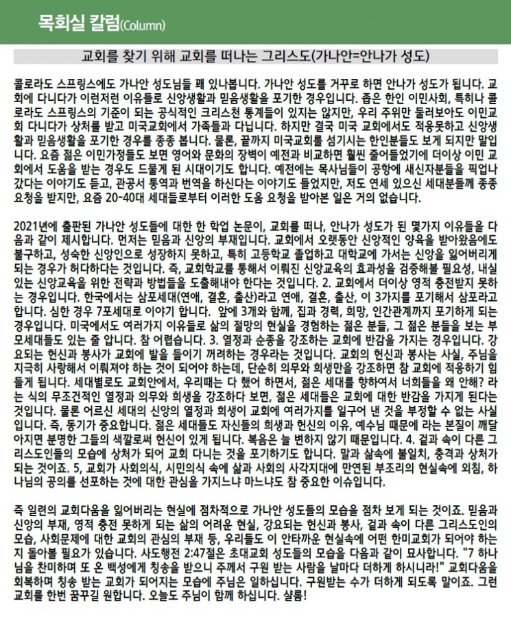 교회를 찾기 위해 교회를 떠나는 그리스도(가나안=안나가 성도)