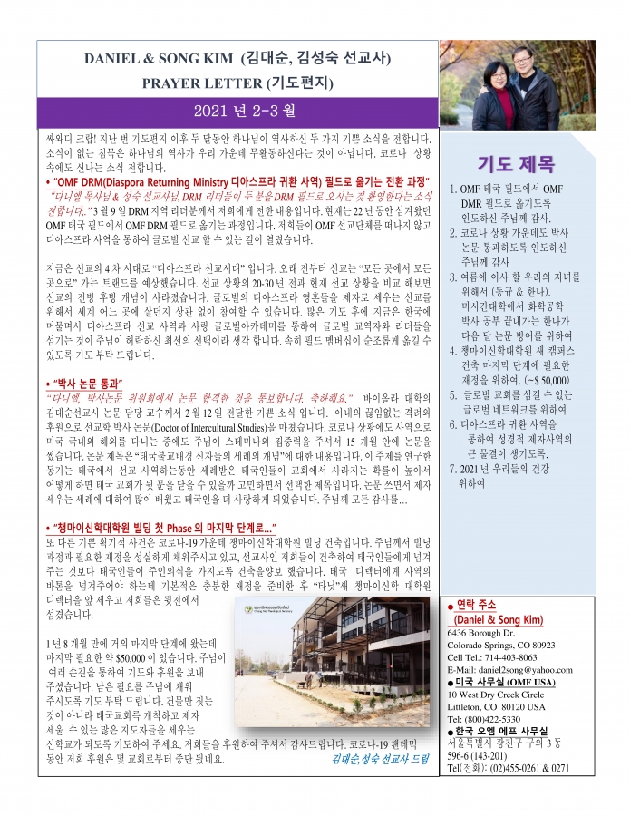 태국에서 온 선교편지 2021년 2월&3월 페이지 정보 작성자 한미연합감리교회 조회 1,386회 작성일 21-03-17 12:30 목록 본문 태국에서 온 선교편지 2021년 2월&3월 이전글2021 나바호에서 온 사역영상 21.03.26 다음글하와이 코나에서 온 선교편지 21.02.28 댓글 0 댓글목록 등록된 댓글이 없습니다. 목록
