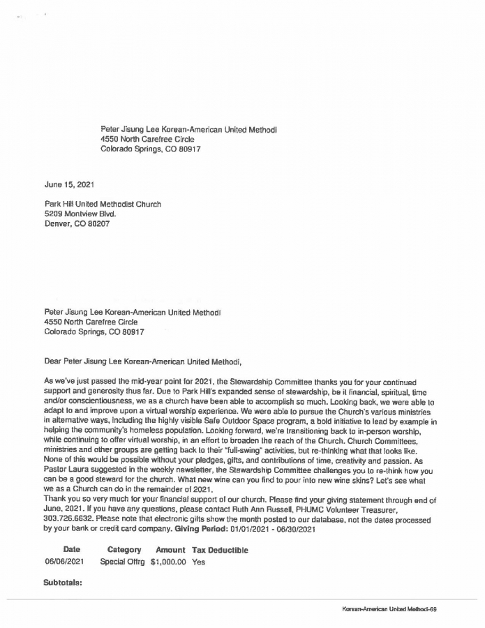 2021 7월 Park Hill UMC 에서 온 선교편지