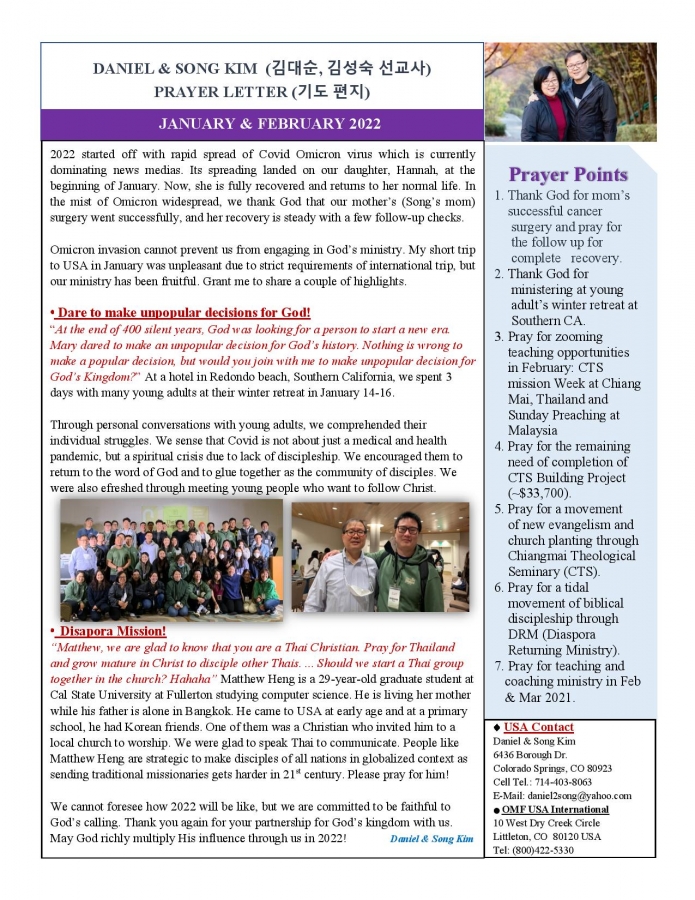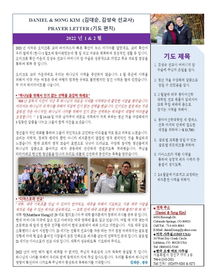 2022 1월 & 2월 태국에서 온 선교편지 페이지 정보 작성자 한미연합감리교회 조회 1,489회 작성일 22-02-04 17:27 목록 본문 2022 1월 & 2월 태국에서 온 선교편지 이전글2022년 2월 터키에서 온 선교편지 22.02.28 다음글2021 12월 태국에서 온 선교편지 21.12.21 댓글 0 댓글목록 등록된 댓글이 없습니다. 목록