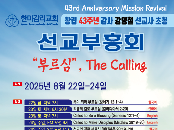 From August 22 to 24, we held a Mission Revival under the theme “The Calling” with Rev. James Kang-McCann, who for the past 31 years has been raising children of mixed heritage and multiethnic families as disciples of Christ through the Amerasian Christian Academy in Dongducheon, Korea. This year's revival was held for both KM and EM, making it a particularly special time. We were reminded once again of the powerful challenge to fully obey God’s calling wherever we are. We are sharing photos that capture the worship and fellowship during the Mission Revival. We sincerely thank all who prayed for and served for this revival, and above all, we give thanks and glory to God who allowed us this blessed gathering!