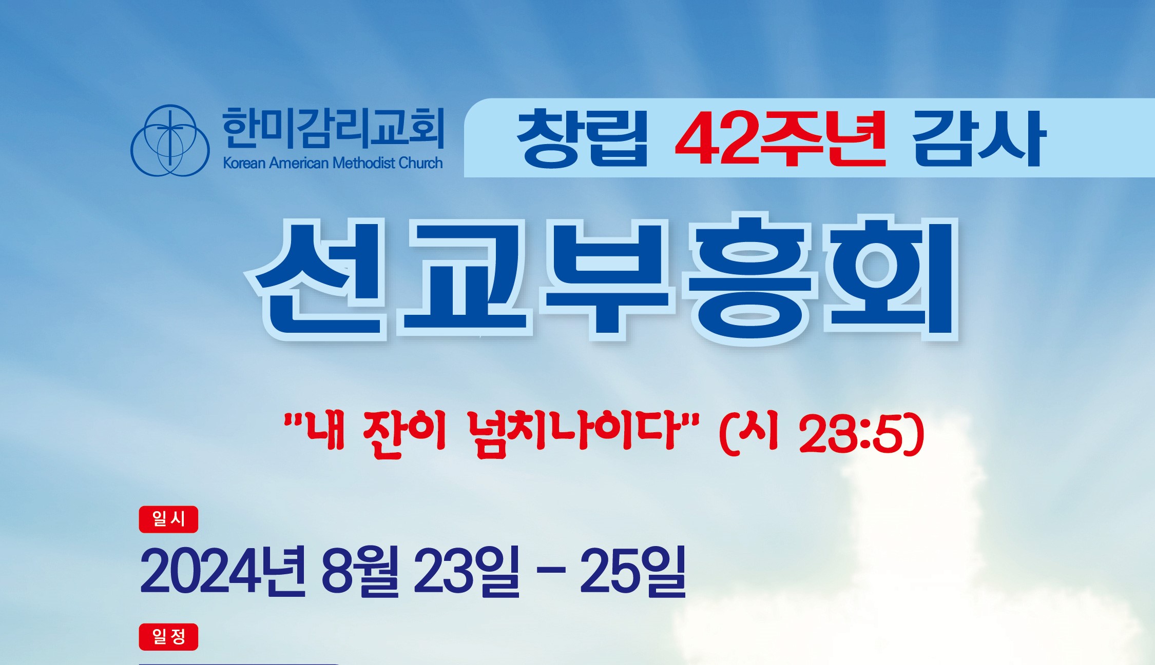 이제 말씀 부흥회가 한 주 앞으로 다가왔습니다. 함께 모여 말씀을 경청하는 가운데 진정 하늘의 참 평안과 기쁨을 누릴 수 있기를 바랍니다. 강사 목사님을 통해서 준비된 말씀이 우리 모두의 마음을 뜨겁게 하고, 새롭게 하며, 이제 중년이 된 우리 교회를 향한 새로움 부름과 비전으로 우리의 마음을 한껏 설레게 하는 은혜가 있기를 간절히 기도합니다. 말씀으로 행복케 될 은혜의 자리에 다시 한번 여러분을 초대합니다!