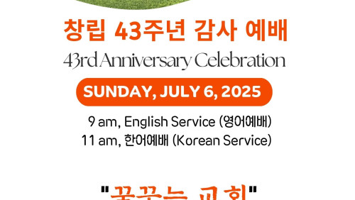 In addition to all this, the Lord has blessed us with many meaningful moments: the Women's Ministry hot springs retreat, joint cell group meetings, “Shepherd Life” Bible studies, the spring church cleanup, and our recent outdoor worship service. Remembering these moments and the abundant grace we have received through them, we would like to invite you to join us for our 43rd Anniversary Thanksgiving Service as we come together with joy and gratitude to honor all that God has done.