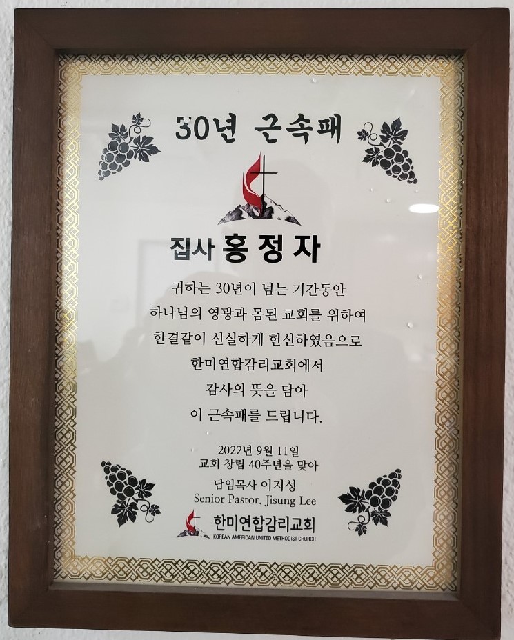 While looking around her home, I noticed a plaque of appreciation that was presented to her at our church's 40th anniversary, in recognition of her 30 years of faithful service. Serving one church for 30 years is no small feat! I understand there are many others in our congregation who have similarly devoted themselves for such a long time. It is a great joy and honor to serve God with such wonderful saints! Thank you, many saints at Hanmi, and praise God whose abundant grace made it all possible!