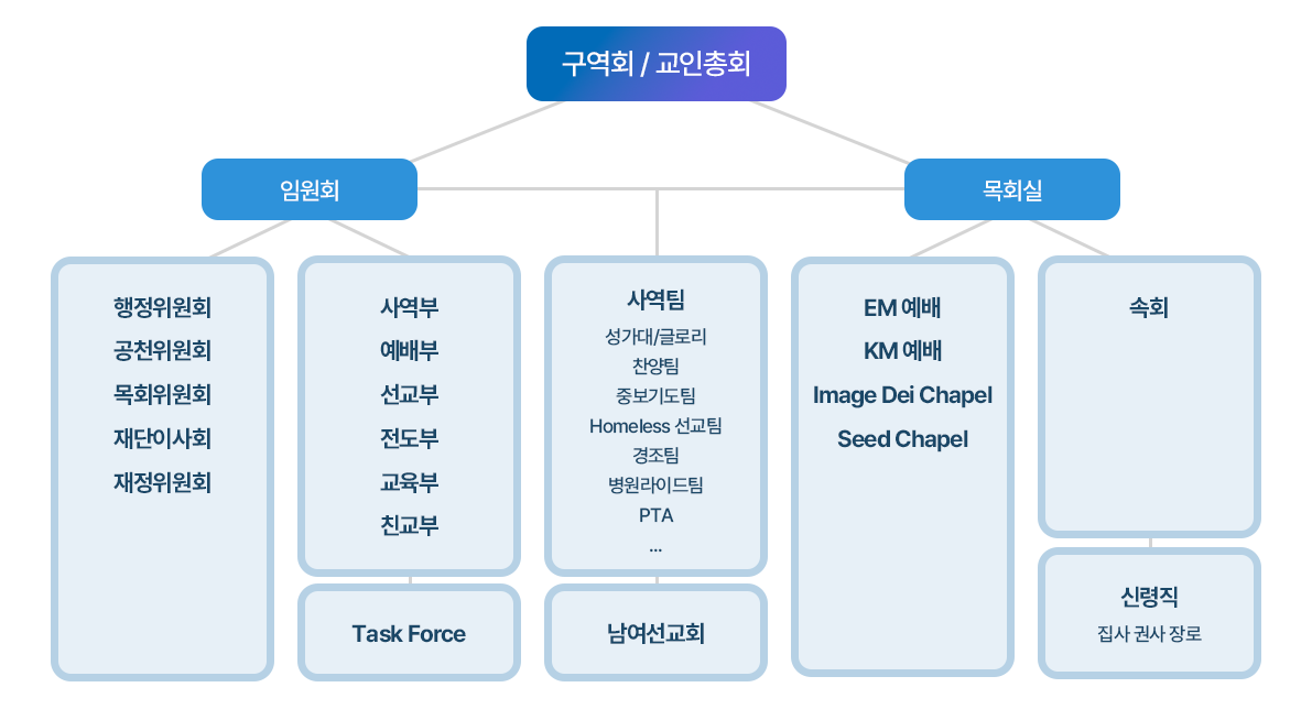 - 예배를 포함한 교인들의 영적 성장과 돌봄은 목회실이, 그리고 교회 행정과 행사 에 관한 부분은 임원회가 주로 관할하게 됩니다.
